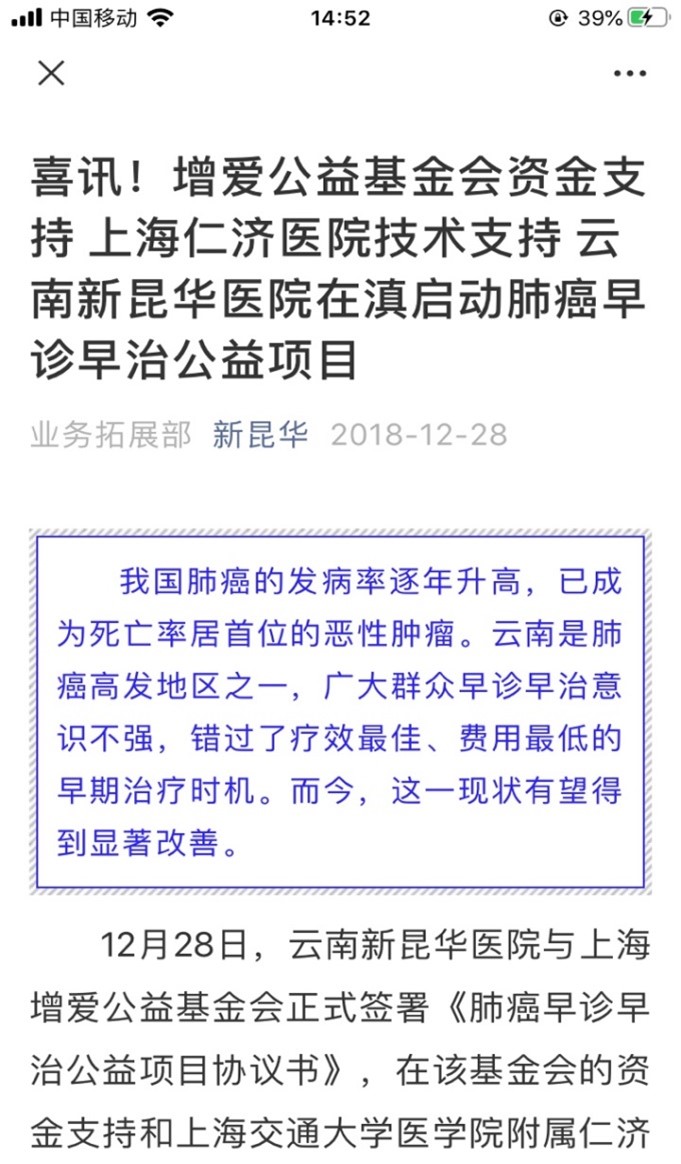 1、2018年12月28日,云南新昆华医院与增爱公益基金会签署了关于肺癌早诊早治公益项目协议书,我院与增爱公益基金会共同确定云南新昆华医院为主要筛查医疗机构。并由我院(云南新昆华医院)选定相关县区的医疗机构承担部分筛查工作。2019年3月,我院与弥勒第一人民医院签约了肺癌早诊早治公益项目协议书,早期人员肺癌筛查及CT检查全部由弥勒第一人民医院负责完成。