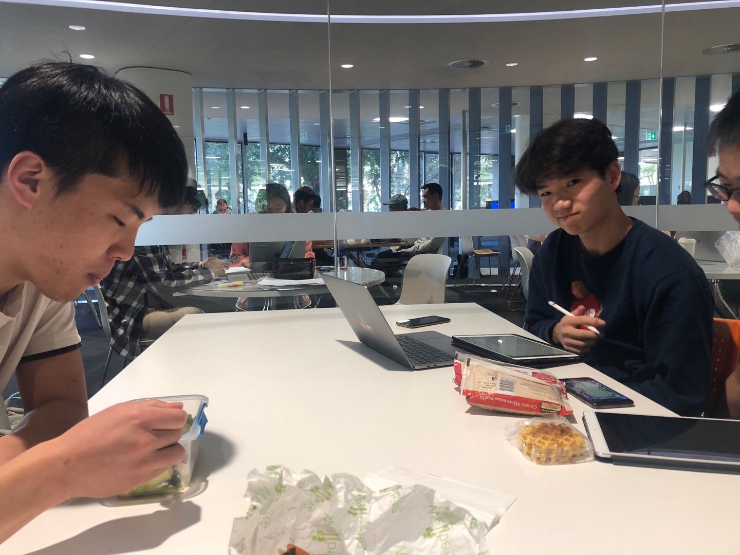同学们课间在图书馆午餐和学习