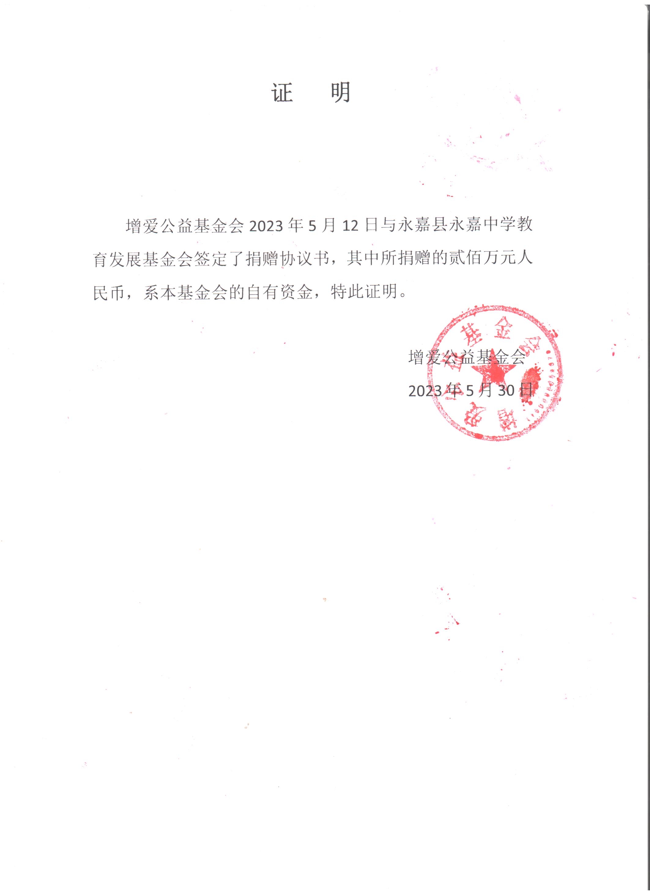 永嘉中学青云班捐赠证明
